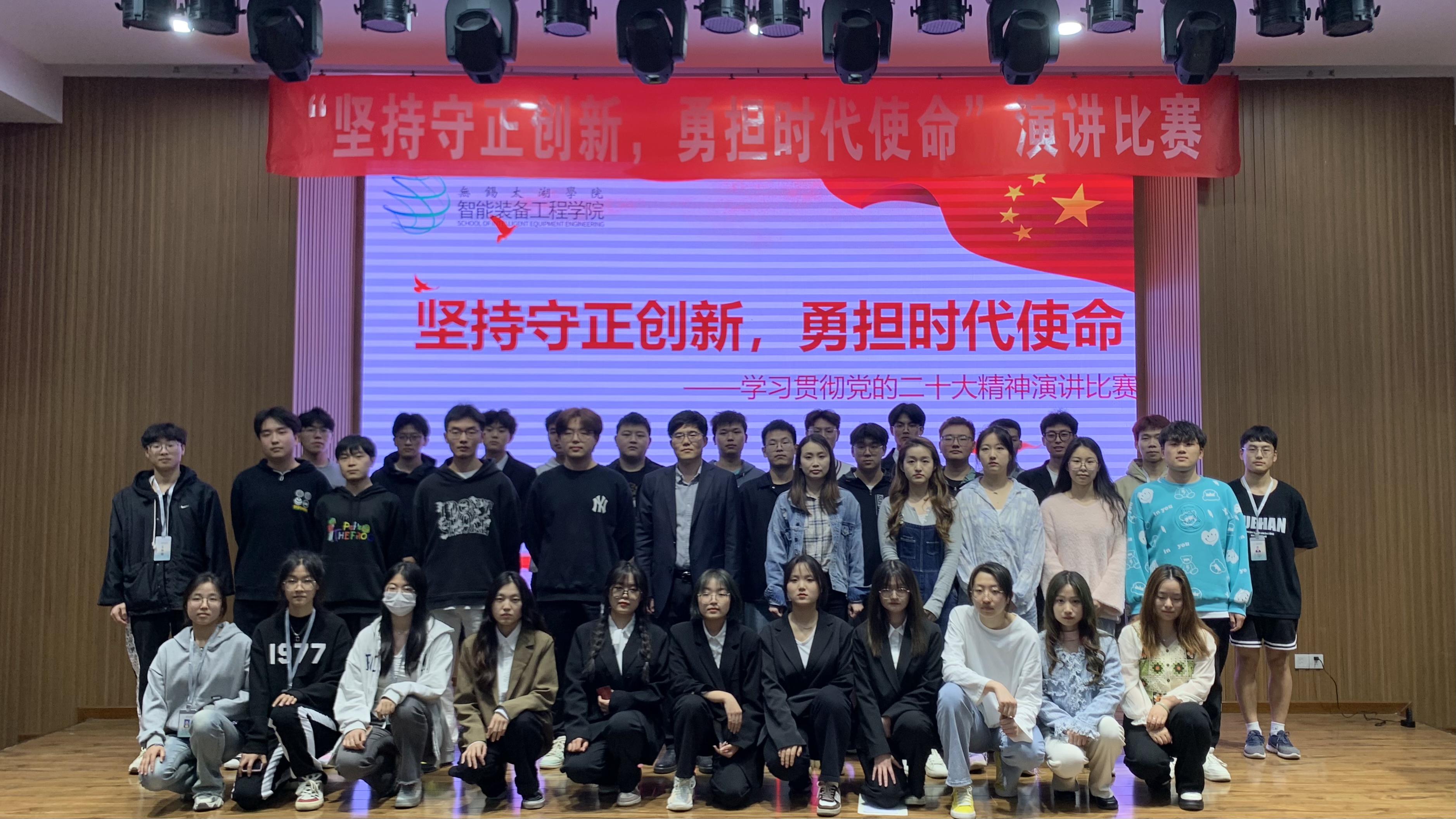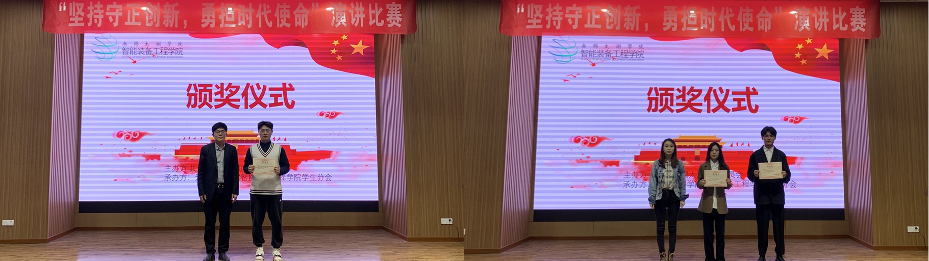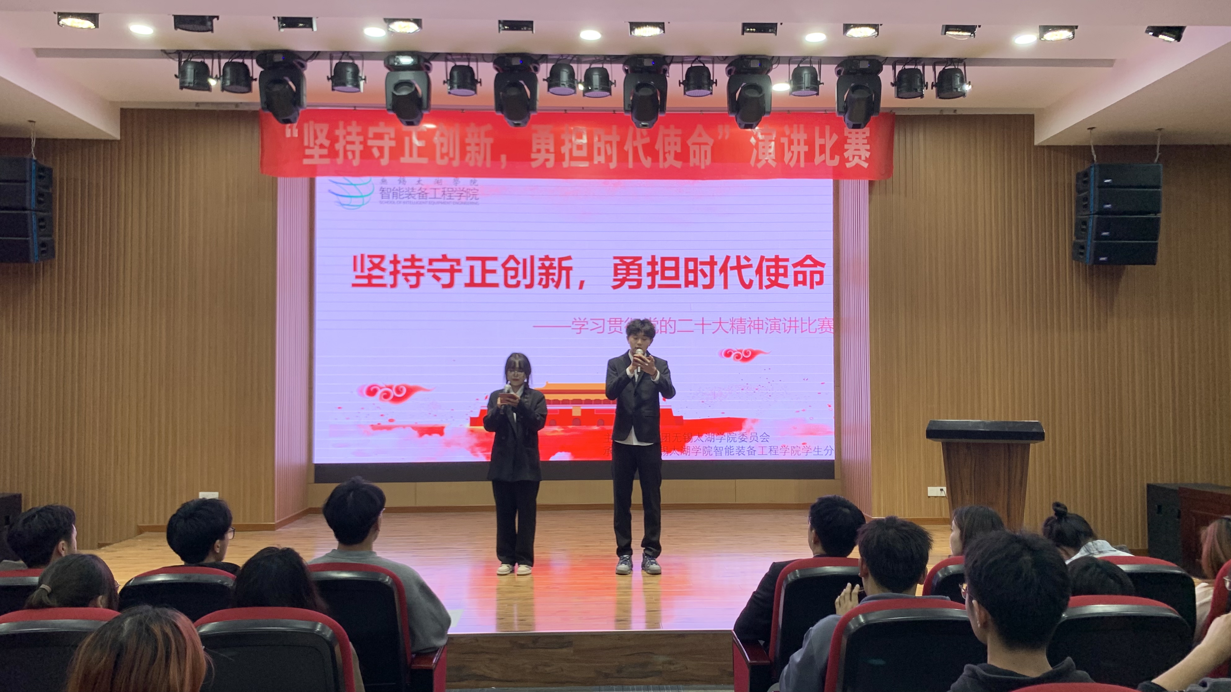 为深入推进党史学习教育,激发同学们爱国热情和责任担当意识,丰富我院学生的课余文化生活,4月12日晚6:30,智能装备工程学院于大学生活动中心A成功举办了“坚持守正创新,勇担时代使命”演讲比赛,担任本次活动的评委有智能装备工程学院党总支副书记杨学圣、团总支书记丁苗、学生分会主席团成员以及各部门负责人。本次比赛由张雨婷同学和葛鹏宇同学主持。