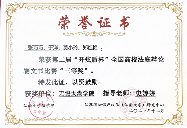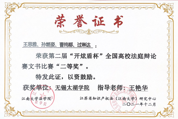 “开炫盾杯”第二届全国高校法律文书比赛,由江南大学法学院主办,江苏省知识产权法(江南大学)研究中心、江苏开炫律师事务所“开炫盾”刑事团队协办,于2021年12月如期举行。来自上海、浙江、山东、安徽等全国26所高校51支代表队204名选手参加了比赛。各高校法学学子的法律文书汇聚江南无锡,充分考验法科学子能否明确案件争议焦点,法律依据是否准确,实体处理是否公正,说理是否清楚透彻,语言是否简洁流畅。