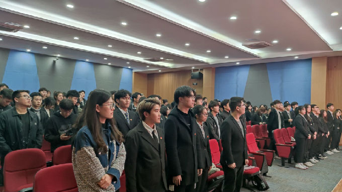 第二项议程会议正式开始,全体起立、奏唱国歌。紧接着,智能建造学院团总支书记戎婷竹开始宣布大会正式开幕。