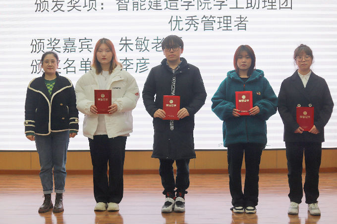大会第一项议程,由智能建造学院学工助理团第四届主席李彦宣读第五届智能建造学院学工助理团优秀管理者、优秀干部、优秀助理名单,并由朱敏老师为其颁发证书。