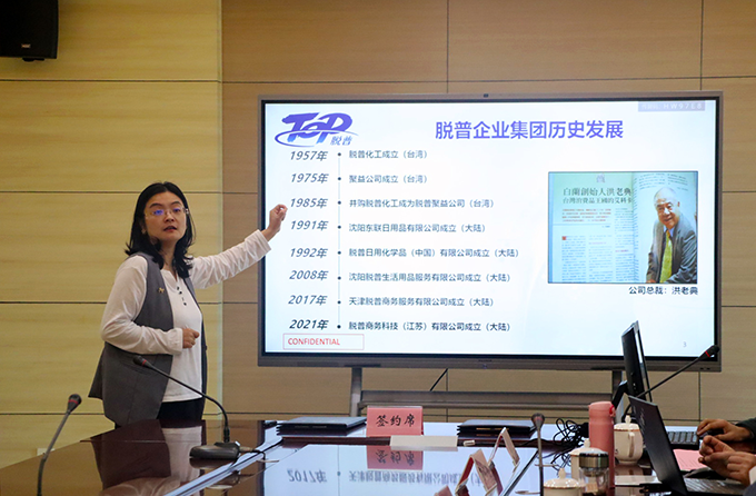 脱普集团陆敏总监介绍了脱普集团旗下品牌、重点品类产品、集团商业布局、公司内训团建等。陆敏总监说道:“脱普集团虽然现在是在做日化的相关产品,但产品的拓展和品牌的推进上面会面向更加广阔的服务范围,比如结合日化的元素,智能化电器,把清洁变得更便利并能够提升我们生活的品质。脱普集团还在不断地拓展自己的品牌,在国外市场,脱普集团也在蓬勃发展。希望跟学校在相关专业领域的合作,能够重新建立新型职业培养的机制和模式。”接着,陆敏总监将脱普集团在2020年与2021年国内日化排行榜上的排名进行对比,看出脱普集团在年年进步,发展前景较好。