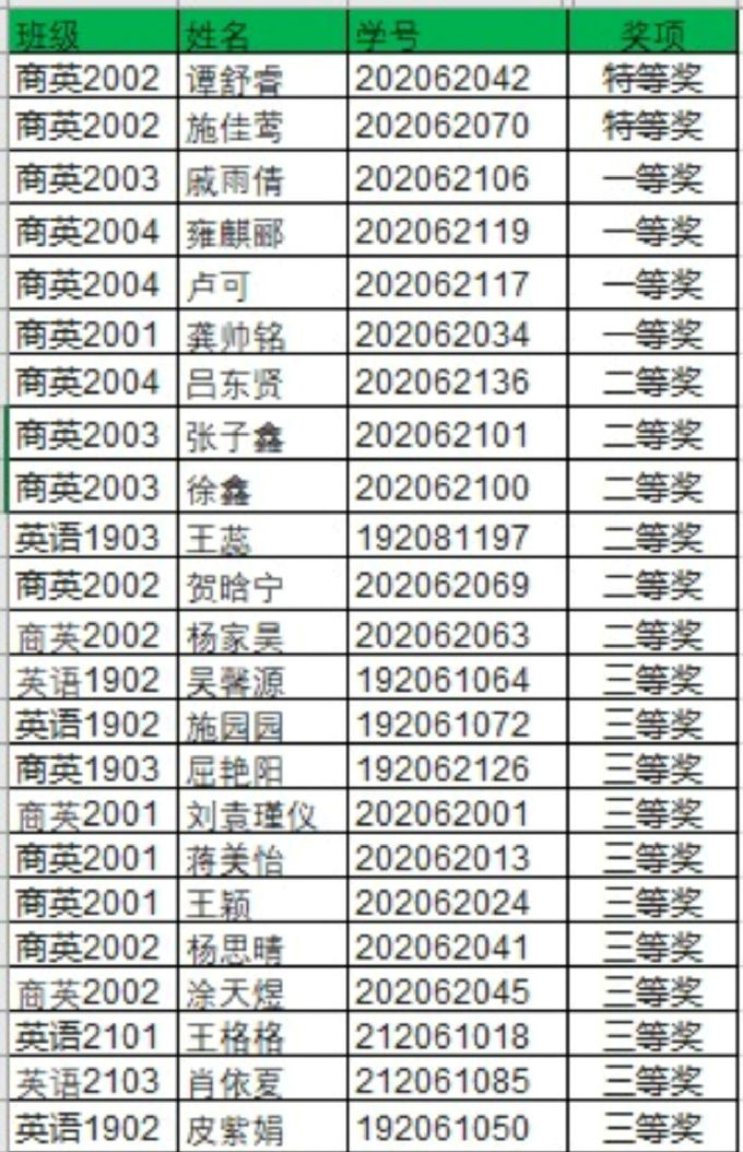 2021第二届江苏省“阿拉丁杯”翻译配音大赛外国语学院初赛顺利结束。本次配音大赛通过在超星上学习通上进行选拔,优胜者将进入省赛。经过大家的激烈角逐,部分同学脱颖而出,获得了此次初赛的胜利。此次比赛的获奖名单已经出炉,此次比赛共有23名同学获奖,特等奖2名,一等奖4名,二等奖6名,三等奖11名。