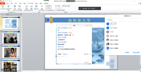 最后与新生进行了很好的互动,及时了解新生的思想和动态,鼓励学生规划好四年的本科学习生活,学生互动积极性高,老师们也回答了很多学生所关心的问题,应该说这次新生专业介绍会取得了非常好的效果。为新生后续学习规划奠定了良好的基础,不再盲目学习,而是有目标、有重点、有规划的去学习。