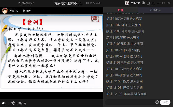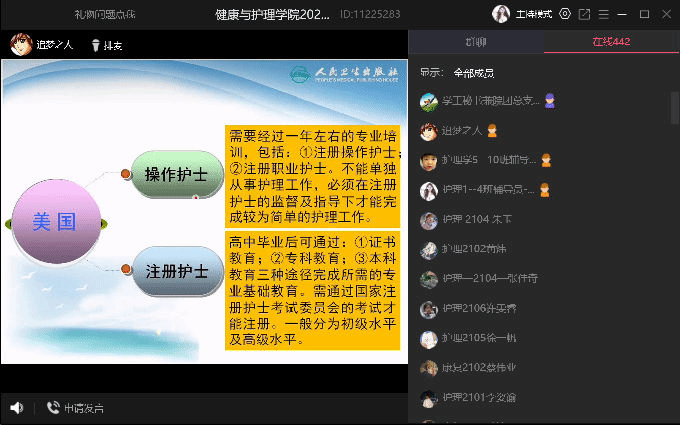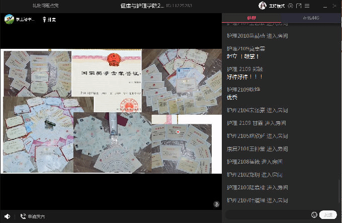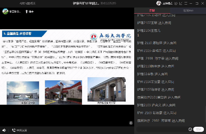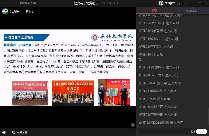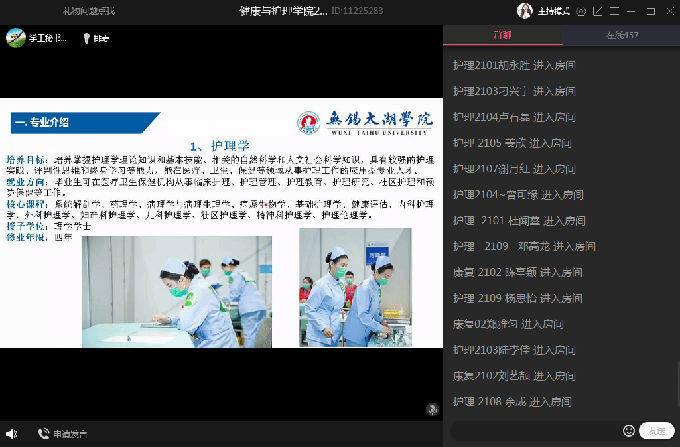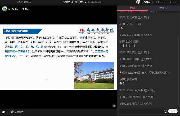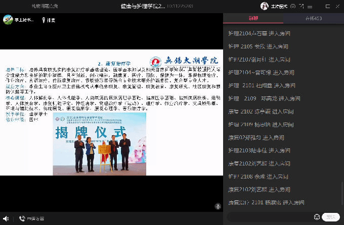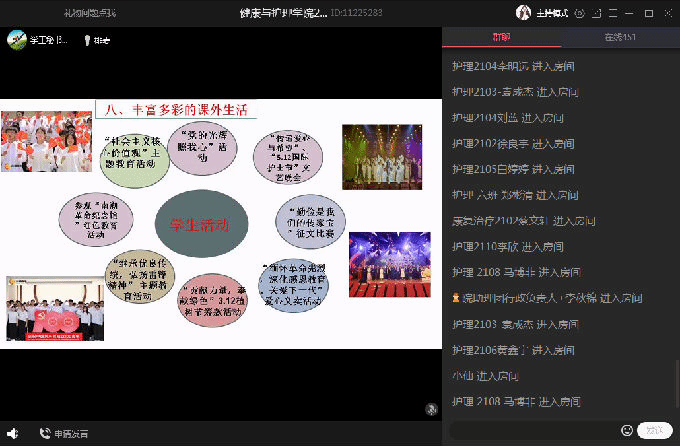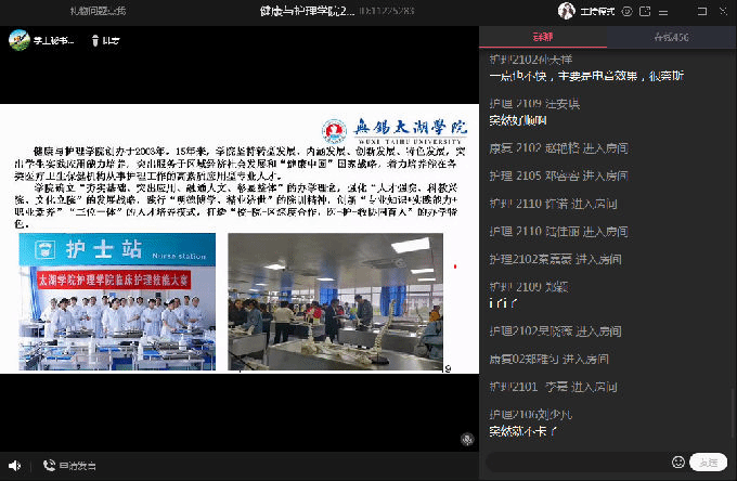 接着,由杨小仙和唐凤两位老师为大家讲述专业教育,杨老师详细介绍了护理专业的专业课程、实验实践、实习事项、行业前景等,让学生们对护理专业有了更深层次的理解和认知。随后,康复专业唐凤老师从康复专业的背景为大家介绍这个专业,她从康复治疗技术专业发展前景出发,提出了康复专业学生的能力要求,简单描述了实习及就业的相关要求,并对同学们做出了相应的期望,两位老师在线上与同学们进行互动,帮助大家答疑解惑。