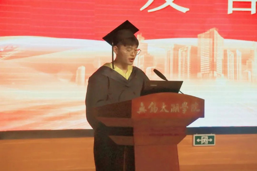 会议第六项议程,优秀毕业生代表通信1701方舒代表发言,他首先对学校的栽培和老师的教导表示衷心的感谢。其次,他细数自己四年在学校的经历,经过时间的洗礼和自己不断地努力,收获了成熟和稳重。最后,他表示在学校的生活是青春里最美好的回忆,之后的生活要不负热爱,积极向上。