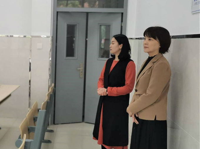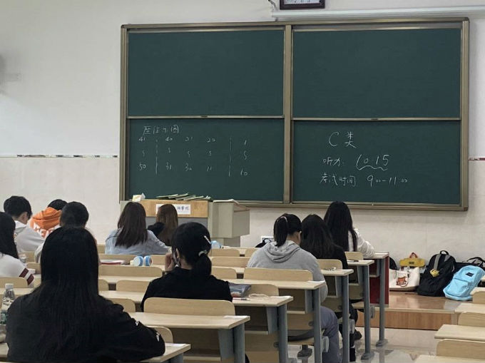 在考试开始之前,考场外的参赛同学们有序排起队伍,待监考老师验证身份和检查物品后入场。考生们胸有成竹,精力充沛,为此次比赛做好了充足的准备。考场的黑板上清楚地写明了本次竞赛的流程和注意事项,并特别标注了两个类型不同的听力时间,提醒参赛学生注意听力时间。外国语学院副院长刘荔、吴旻昊高度重视此次赛事,在考场中巡视,帮助一些考生解决问题,为他们能够顺利参加完考试保驾护航。
