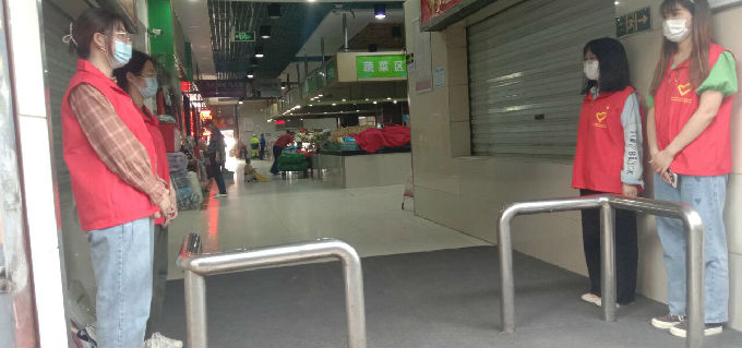 学生党员一到便积极投身到社区史书记安排的工作中,目前疫情虽然处于稳定状况,但是仍然不容松懈,在各方面尤其是公共场合需要时刻提高警惕。学生党员们了解到了例如农贸市场这种人流量大、摊贩多的大型公共场所,尤其需要一些人手,去引导社区居民坚持戴口罩,越是在这样看似稳定的时期,越是不能松懈,不能掉以轻心,学生党员们纷纷穿上外国语学院的志愿者服装,有序的在贸易市场各个出入口引导社区居民佩戴口罩进入人群拥簇的贸易市场。在活动开展的过程中,社区居民们都十分配合学生党员们的引导工作,相关工作开展的很顺利。