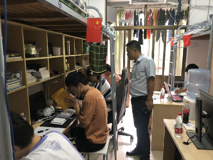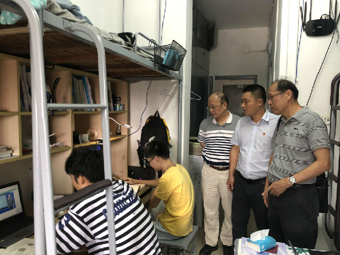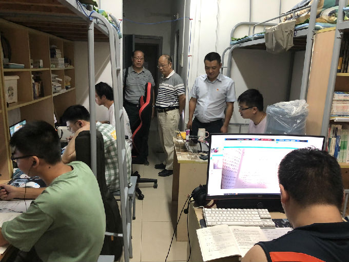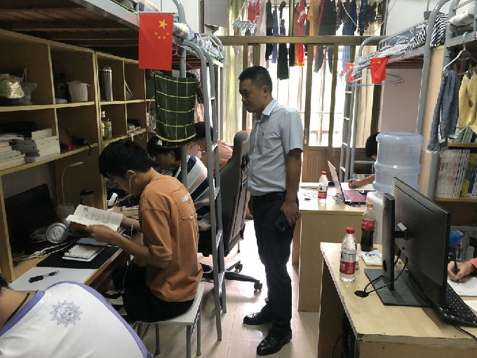 在院领导巡视宿舍的过程中,有不少宿舍全体正端坐在电脑桌前,上着网课。院领导们看着他们认真的眼神不忍去打扰他们。返校后,学生们能够这么快速的便进入学习状态,这更是对防疫工作的肯定。
