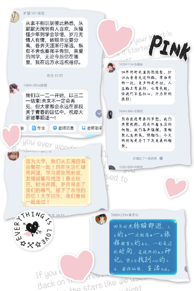 四年光阴,对我们护理16级来说是一个关于青春梦想的轮回。四年前的相迎,历历在目,如今的分别,已经开始。背上行囊离开母校的你们,是我职业生涯中陪伴的第一批大学学子。我很荣幸,四年来一直与你们相伴。