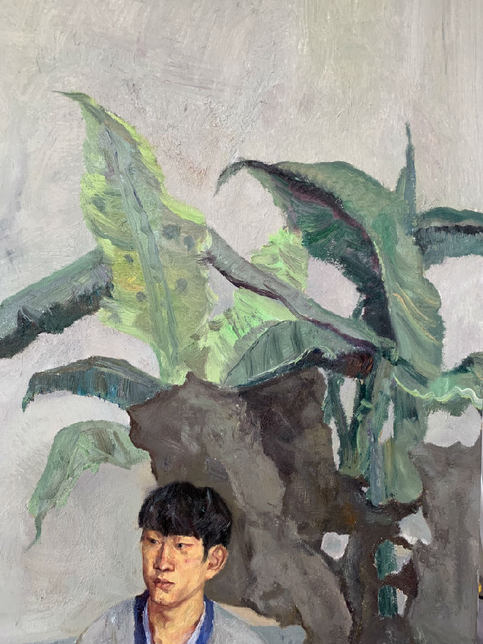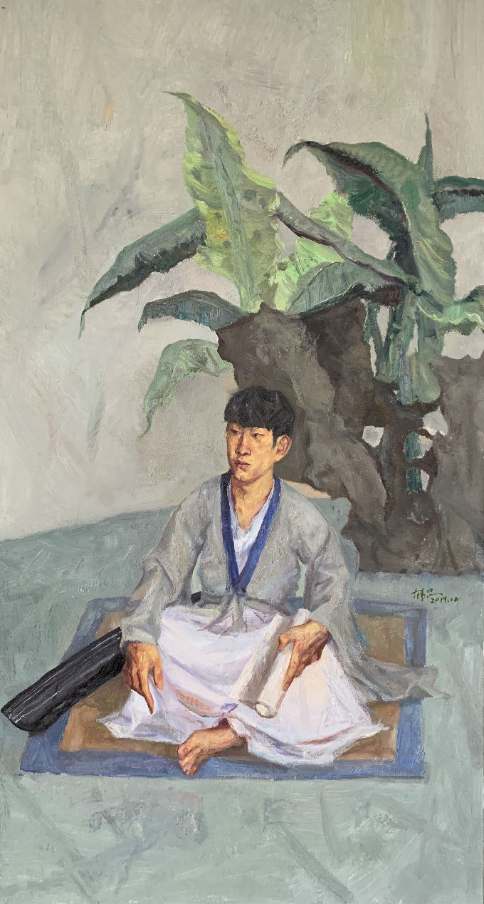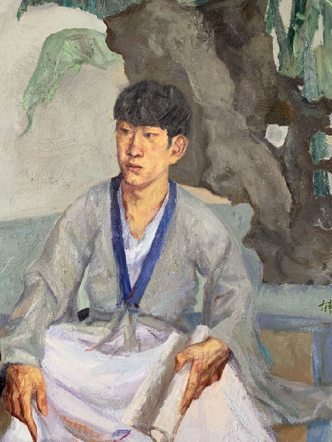 以国画作为油画的创作蓝本本身就带有一定的挑战性,既要保持院藏文物原有的画面布局特质,同时尽可能地发挥油画的本体语言魅力。此次创作构想缘因无锡博物院院藏明文徵明为士人琴师杨季静所绘鸣琴肖像为灵感。通过观摩真迹藏品,深为古人智慧与才情所折服。画面大胆保留了原画的基本构图,人物置于恬淡清远的青灰色调之中,左手执书,古琴在侧,年轻人着汉服若有所思,画面气氛宁静致远,暗示当下年轻人读书思考,回归传统文化的源流。