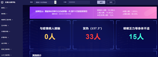 据悉,该系统目前已成熟应用了学生假期前往武汉情况、与湖北(武汉)人员密切接触情况、个人健康状况等信息的填报功能及实时定位功能,后期还将启用返校申请管理功能。辅导员每日通过后台复核学生填报的相关信息,与未填报、发热、位置异动等需特殊关注的学生逐一联系,及时掌握学生具体情况及动向,极大地提高了学生疫情防控工作开展的准确性和针对性。