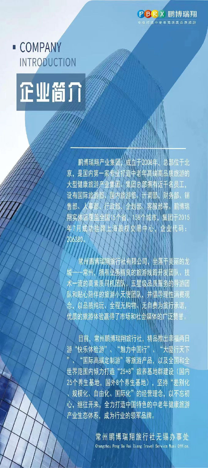 鹏博瑞翔产业集团,成立于2008年,总部位于北京,是国内第一家专业打造中老年高端高品质旅游的大型健康旅游产业集团。鹏博瑞翔实体店覆盖全国15个省,158个城市,没有国际旅游部、国内旅游部、计调部、财务部、销售部、人事部、行政部、企划部、客服部等多个部门。