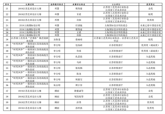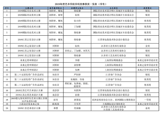本网讯 2019年度在 “以赛促学、以赛促教”教学方针的引领下,艺术学院全体师生以积极的姿态投身到各级各类专业竞赛中,频传佳音,频获佳绩。通过比赛,一方面锻炼了师生的专业水平,尤其是教师的教学指导水平;另一方面,通过比赛,大大增强了获奖学生的成就感,提升了自信心,同时对于没有获奖的同学也有很好地激励和鞭策作用。总体来说,将比赛纳入到艺术学院各专业的教学过程中,学生在专业学习上的主动性显著提高。同时,通过比赛可以和其他院校的师生同台竞技,了解学科前沿信息,发现自身还存在的不足,也在很大程度上对外展示了best365英国在线体育官网艺术学院的品牌形象。