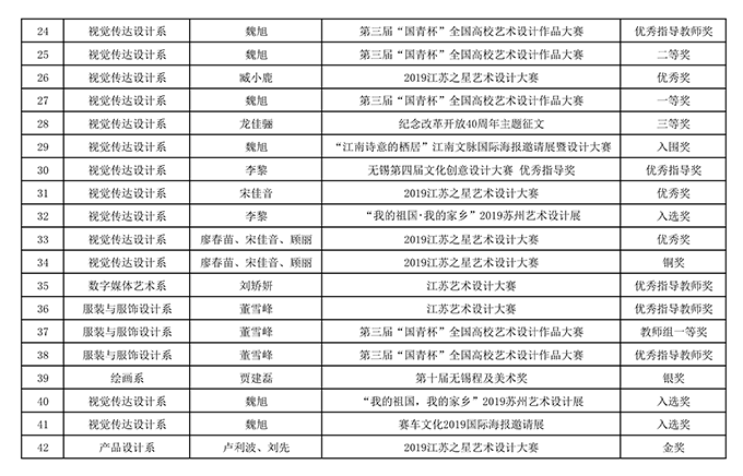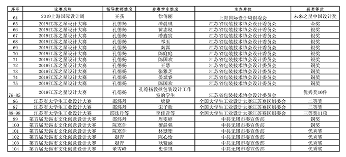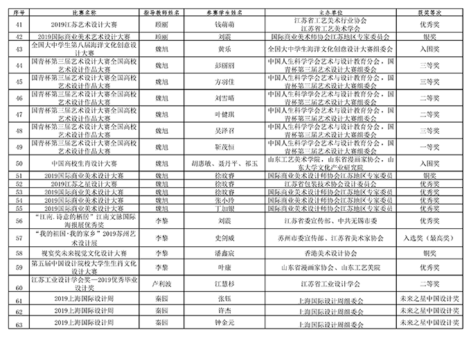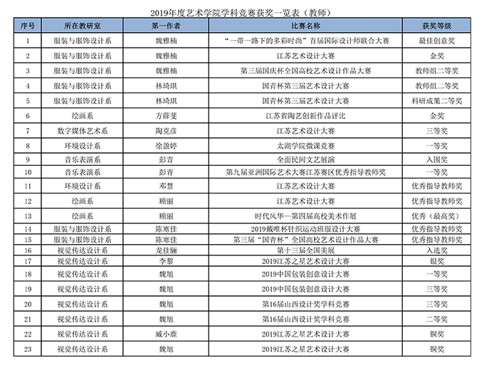据不完全统计,2019年艺术学院教师指导学生获奖104项,教师在各级各类比赛中获奖42项。仅在“2019江苏之星艺术设计大赛”中,艺术学院的老师们获得金奖1项、银奖1项、铜奖3项、优秀奖3项,学生们斩获金奖1项、银奖10项、铜奖8项、优秀奖17项的好成绩。在由江苏省教育厅主办的“时代风华”——第四届江苏省高校美术作品展中,获得优秀奖(最高奖)三项,入选奖6项。