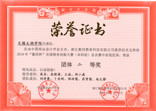 2019年“衡信杯”全国税务技能大赛总决赛于11月13—15日在浙江杭州成功举办。大赛由中国商业会计学会主办,由“衡信教育科技有限公司”提供技术支持。经过海选赛、预选赛的层层选拔,来自全国各地的140支代表队420名选手进入决赛环节。在指导老师高岩、成晓婧、王晶、邹小磊的精心指导下,由高岩、成晓婧老师带队、5名同学(郑琼慧、刘泽豪、卜亚刚、苏紫茵、赵文静)组成的best365英国在线体育官网代表队不负重望,最终以优异成绩获得本科组团体二等奖,为学校和学院争得了荣誉。