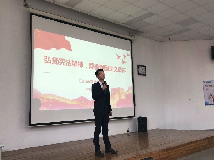 为学习贯彻党的十九大和十九届二中、三中、四中全会精神及全国教育大会精神,认真落实习近平总书记关于宪法学习宣传教育的系列重要指示精神,响应中宣部、司法部、全国普法办2019年全国“宪法宣传周”工作安排,12月5日,外国语学院于八号楼成功开展“弘扬宪法精神,厚植爱国主义情怀”宪法专题讲座。本次讲座由学工秘书姚靓雯主持,江苏海辉律师事务所王诏炜律师主讲,大一全体同学共同参加。