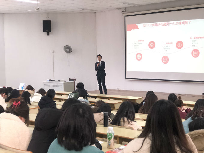 然后,王律师还结合实际案例讲述了我们大学生可能会遇见的法律问题。他建议我们遇见法律问题首先要冷静自我,考虑有没有合理合法的对策,在自己解决不了的情况下,可向学校老师求助,或咨询专业人士。他讲到:“比起方法而言,更重要的是你要去相信它,相信的力量是很大的”。