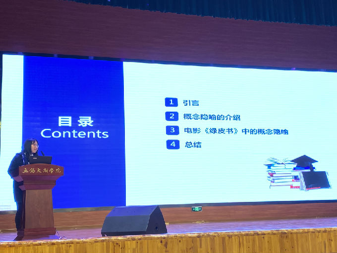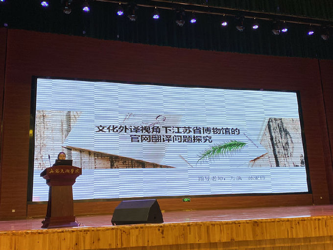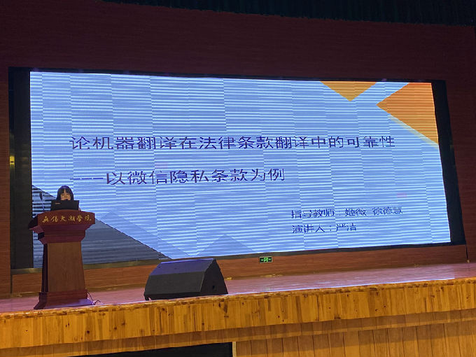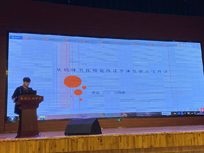 大一新生朱喆同学的论文报告不由令人眼前一亮,虽才入学不到半年,却不乏内在知识的积累,向大家阐释了数字媒体对新闻产生的影响。严洁同学流利的演说,向同学们传达了新型话题--机器翻译在法律上的可靠性。孙国燕和张瑞心这一组同学,向同学们介绍了人和人工智能之间的竞争,人类和AI在未来该如何保持平衡? 费欣月同学通过一部众所周知的电影《绿皮书》延伸出如此深刻的思考,不得不令人感叹,学习与生活息息相关。赵旭东同学浅析许渊冲唐诗翻译对中国文化走出去的影响,在展示中华文化博大精深的同时,也宣扬顺应时代的潮流是增强国家文化软实力的必要前提。刘思源同学展示的吴地饮食文化,就像一条无形的线,从味蕾到大脑,串联了食物与翻译的内涵。十一位选手以不一样的眼光去挖掘发现,更是在自己的专业基础上进行创新研究,自信满怀的少年们激昂探讨历史文化、诗词歌赋、科学技术,震撼着在座同学,激励同学们奋发前进。