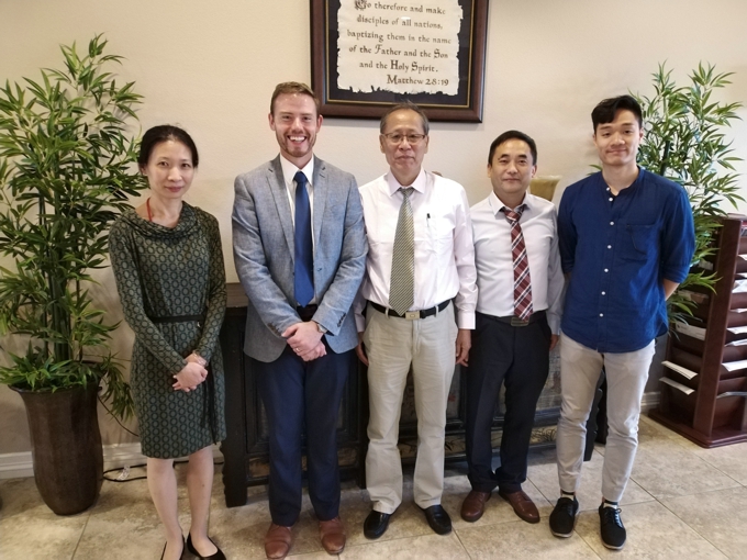访美组与拜访DBU原校长Dr.Cook(从左至右:Ms.Belinda、Dr.Cook、惠晶教授、秦向东博士、宋怡博士