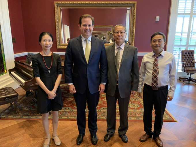 访美组拜访DBU校长Dr.Wright(从左至右:宋怡博士、Dr.Wright校长、惠晶教授、秦向东博士