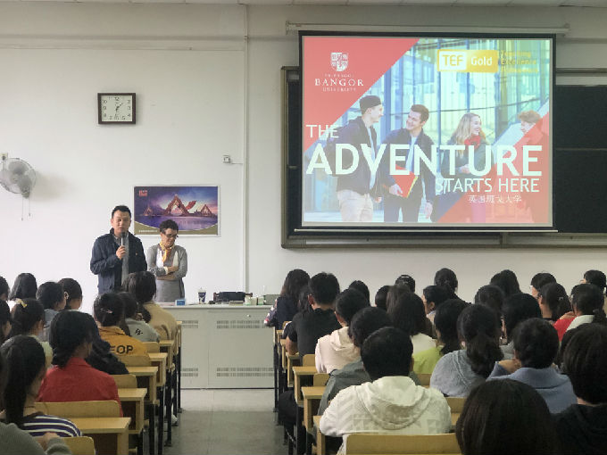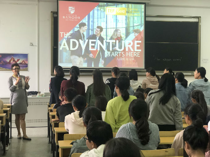 随后,Brown女士用短视频向同学们介绍了英国班戈大学的基本情况。也告诉同学们这是一个很好的机会,有条件的同学可以去尝试,并且详细介绍了申请3+1+1硕士课程、获奖学金等具体要求,包括MA Applied Linguistics for TEFL 和MA Translation Studies的专业情况,以及对于雅思成绩的具体要求以及作为两校合作项目同学们可获得的便利。