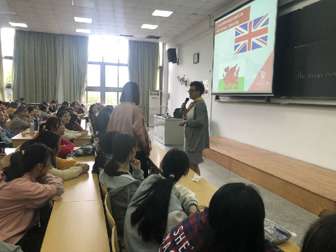 Brown女士认为学生应该多听多问。为此她专门设置了提问环节。在与同学的一问一答之中,解答了同学们的疑惑。此外,Brown女士还鼓励同学们,多用英语积极提问发言。还向同学们展示了中国留学生在英国班戈大学多彩的留学生活感受及经验。