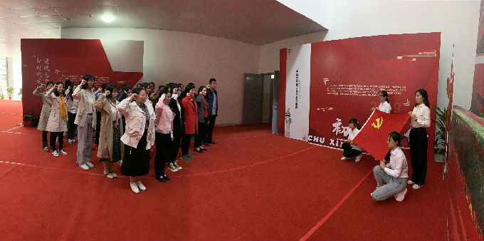 最后,全体党员前往校国政馆重温入党誓词。面对红色的党旗,各党员郑重宣誓。一句句掷地有声的宣誓词表现了党员同志们对党的忠诚、为民担当的政治觉悟和强烈的责任意识。宣誓仪式令各党员的神圣感、荣誉感和使命感得到了强化。