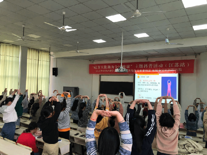 随后,无锡市中医院的医生和护士带领学生一起学习“八段锦”,理论与实践相结合,以全新的方式学习到了健身知识,并达到了疏松经络,强健筋骨,强壮内脏的效果,收获满满。最后,叶志超处长对此次活动进行总结发言,表达了对中医药文化发展的希望。