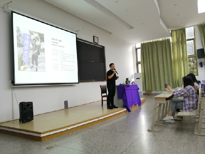 瑞思英语总部运营部产品运营总监吴帅也给大家作了精彩的演讲。吴老师同是英语专业毕业,他带领同学们一起体验了幼儿教师的课堂互动模式。他先手把手教导如何描绘“Baboons are big monkeys”,热闹的氛围下同学们一下进入了状态。随后,他给同学们出了几个小难题,例如:“I see an empty elevator ”,“I see an elegant elf”等生动的英文短句。同学们互相讨论,片刻之后,老师还邀请了几位同学上台演示。吴老师幽默的演讲方式引得同学们哄堂大笑,同学们也在他的耳濡目染下学到了很多。