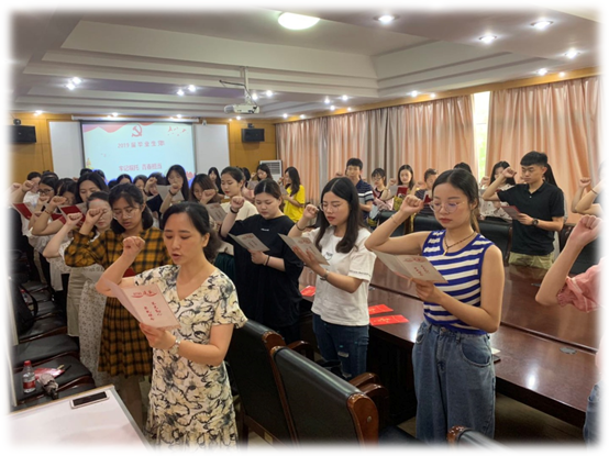 2019届毕业生党员在学生党支部书记蔡颖老师的带领下,怀着无比崇敬的心情,庄严的举起右手,面向鲜艳的党旗,重温入党誓词。誓言铿锵有力,表达了为党的事业奋斗终身的决心和忠心,以坚定的理想信念、饱满的工作热情踏入新的征程。
