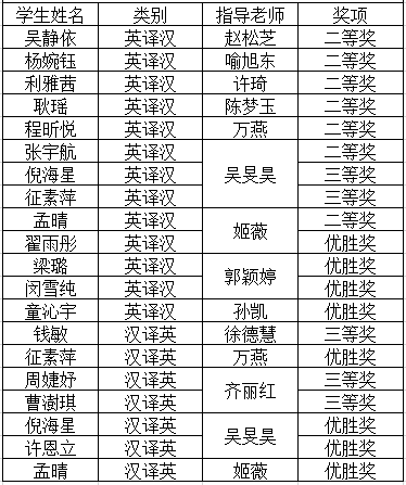“LSCAT杯”江苏省翻译大赛旨在培养高素质语言服务人才,满足江苏省日益扩大的对外交流需求,推动高校英语教学整体发展,促进专业学科建设和语言服务行业的繁荣与发展。本次大赛吸引了包括南京大学、东南大学、南京师范大学在内的50多所省内高校4000多名选手参赛。我院对此次比赛高度重视,在包通法院长的关心和支持下,各外语系教师积极组织学生参与,经过赛前指导教师的认真指导和学生的精心准备,最终取得了优异成绩!