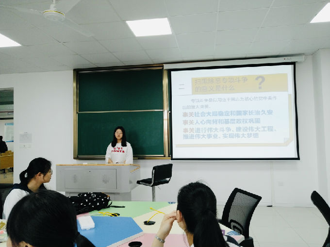 随后文博雅同学结合身边的典型事例,图文并茂地让同学们了解到当前黑恶势力对社会带来的巨大危害,积极宣传打击黑恶势力和违法犯罪的重要性;为了增强同学们的“扫黑除恶”意识,对此,她强调:“扫黑除恶专项斗争是以习近平同志为核心的党中央做出的重大决策,事关社会大局稳定和国家长治久安;事关人心向背和基层政权巩固;事关进行伟大斗争、建设伟大工程、推进伟大事业、实现伟大梦想!”