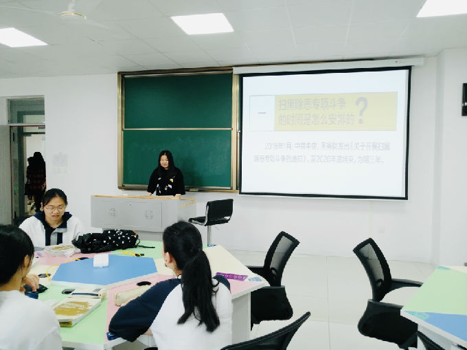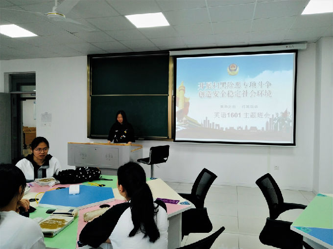 为了贯彻落实《教体系统扫黑除恶专项斗争工作方案》,让同学们认识到黑恶势力、违法犯罪给社会带来的危害,宣传打击黑恶势力和违法犯罪的重要性;5月14日,外国语学院英语1601班班委组织学生开展了以“扫黑除恶”为主题的班会。