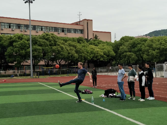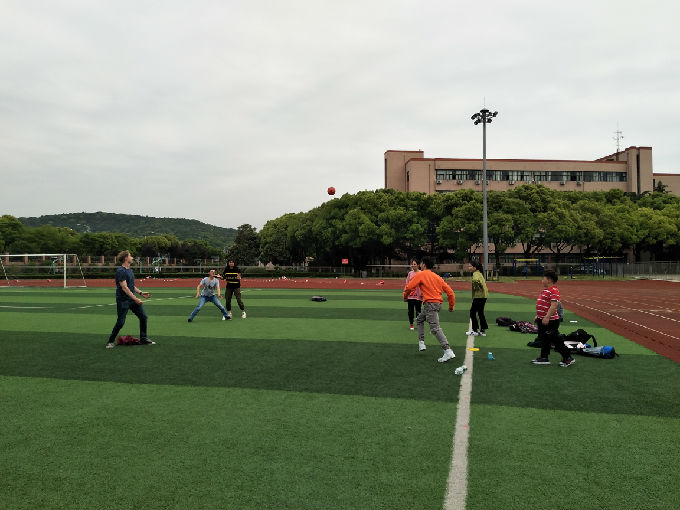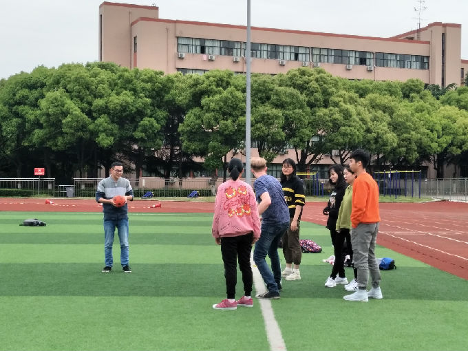 全体同学一共分了四个站点,每个站点都有同学负责传球接球,场外由另外一个组的同学围着外圈依次跑向不同的站点,站点的同学接到球后场外的同学就必须停止在站点上;否则出局;最后以这样的方式跑向起点赢得比赛。
