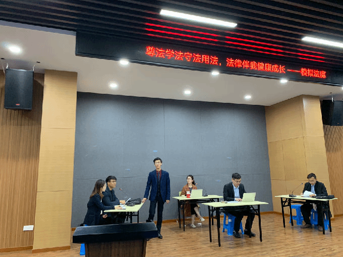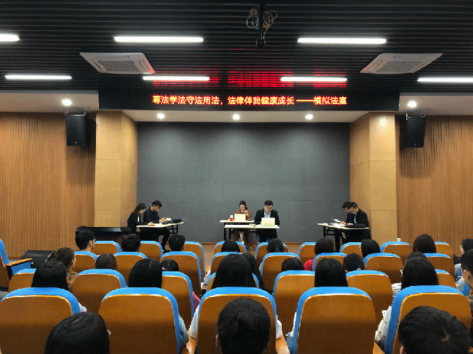 为了响应江苏省教育厅关于开展首届全省青少年法治宣传周的通知,让学生充分了解法律,掌握基本的法学知识、理解宪法和法律的基本精神、基本规范,提高对法的重要性的认识,增强法律意识,外国语学院于5月7日下午在大学生活动中心A开展“尊法学法守法用法,法律伴我健康成长”模拟法庭,外国语学院法学系主任王艳华、学工秘书姚靓雯出席。本次模拟法庭邀请了江苏海辉律师事务所徐琰、赵小舟、王诏炜、周一心、奚晨、嵇智捷等人参与。