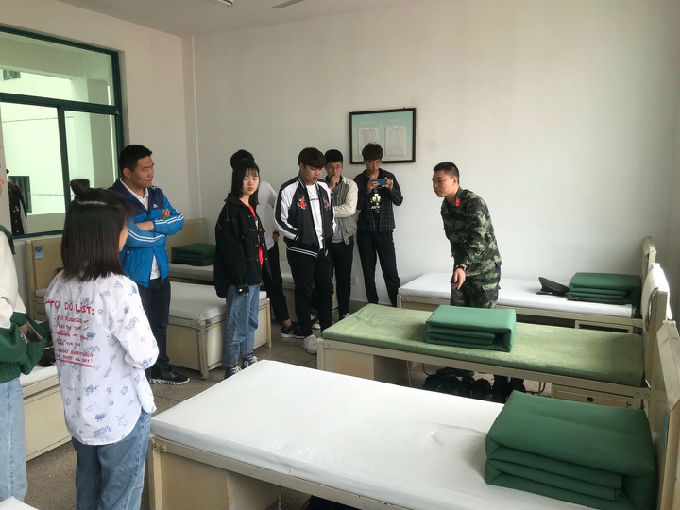 表演结束后,同学们跟随指导员来到了宿舍、活动室和学习室,观看了官兵们现场演示“豆腐块”被子的叠放,他们将被子整理得平平整整、棱角分明,令在场同学赞叹不已。接着,大家还参观了手枪和步枪等武器装备,感受到了军之威猛、国之强大。