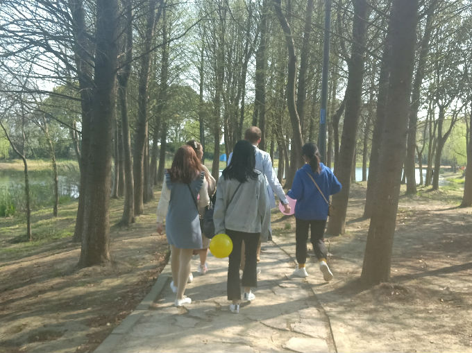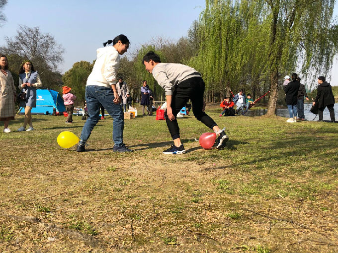 同学们与外教围坐一起,谈中英文化差异,增长见闻;亲近自然,感受大自然的美好。踏青怎能少了游戏互动环节?同学们与外教一起每人脚上绑一个气球进行游戏比拼,煞是有趣。