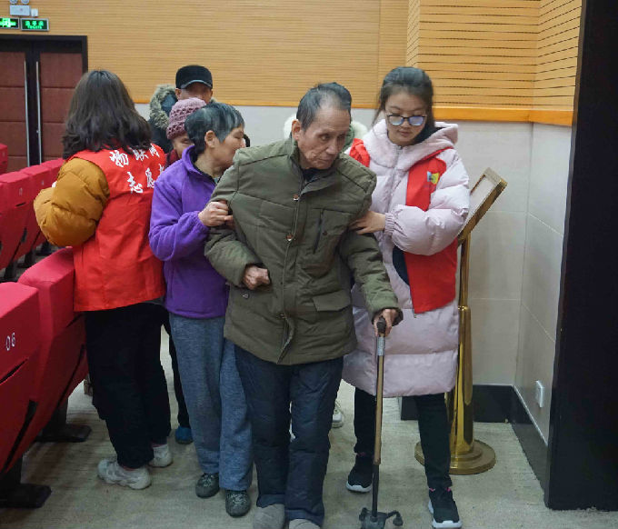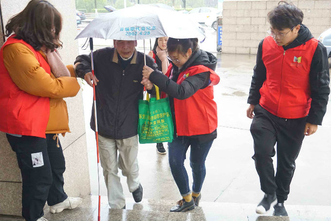 活动开始前,物联网工程学院的志愿者们有序的分成两队,一队撑着伞在车站接应盲人,另一个队伍站在大厅的门口,将他们引到座位上。