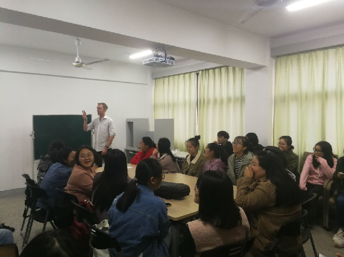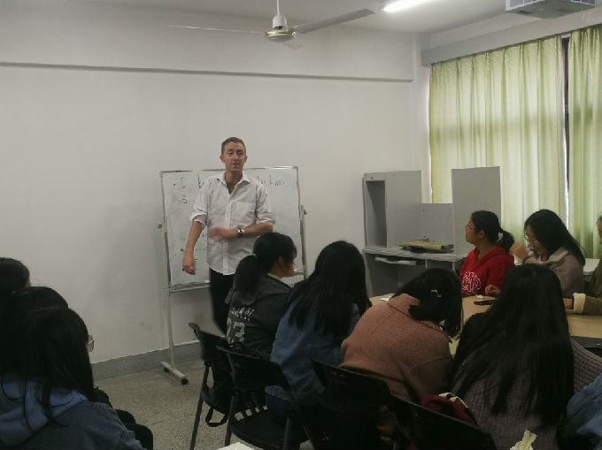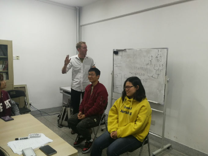 活动由Michael的自我介绍开场。特别的Michael给予我们特别的开场白。他的自我介绍的正确打开方式是猜谜。Michael在黑板上写下三件事情,其中一件事情是假的,其余两件事情是真的。让我们猜猜看,哪件事情是假的。冰雪聪明的我们一下子就猜到Michael出生于美国是假的。或许他不知道我们早就知道他来自英国。而且通过他的英式发音可以判断出。接着是同学们相互的交流,两两一组按照Michael的自我介绍方式向对方介绍自己。由此一来,促进大家开口说英语,同时也增进感情交流,借此机会认识不同的人,和不同的人打交道。听了大家的“三件事”,似乎,大家有共同的经历呢。有趣的是,一些同学的其中一件事情都是会说德语,或许是受Matt的影响,想到Matt就想到德语。然后,是精彩的才艺展示。一位漂亮的小萌新,用二胡为我们演奏一曲,二胡给人以沧桑之感却又扣人心弦。八年习得一专长,萌新的奏乐也向我们阐述坚持之道。结束之际,大家送上热烈的掌声表示感谢。Michael的吉他弹唱也赢得大家的欢心。表演之前,Michael先把歌词写在黑板上,给大家详细地分析句子的结构成分,讲解了生词的意思,帮助大家理解歌词。大致理解之后,Michael开始他的表演。独特的音色,浑厚的嗓音,Michael的歌声娓娓而来,仿佛在与一个活力四射的青春少年派对话。此时热烈的掌声传达的是我们被Michael的歌声深深的吸引住了,也感谢Michael教我们英文歌。最后最精彩的环节是默契大考验游戏。在场的同学被分成四组,两两PK。三名组员只能用英语阐述Michael写下的词,不能用中文和手势,另一名成员猜,得分最高组胜。在游戏的过程中,同学们再一次练习自己的口语,一定程度上锻炼了自己的表达能力和语言组织能力。小游戏大智慧,不亦乐乎。