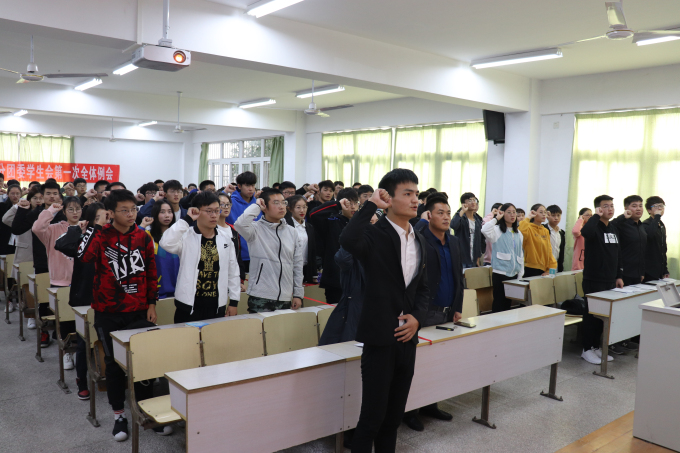 第六项是上一届优秀部长许祁丰发言,许祁丰分享了自身的工作经验,简明扼要,并对学生会成员们给与了更长远的建议。接着是第七项议程,本次大会所发展的新部员,他们在学生会主席柏左政的带领下完成了宣誓,成为了光荣的物联网工程学院分团委学生会的成员。