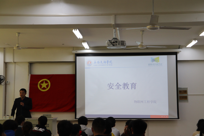 为增强学院全体师生安全意识,提高大学生自身的自我保护能力,保障大学生个人安全健康成长,2018年11月2日中午12点,物联网工程学院安全主题教育动员大会在7号楼118举行召开,参加动员大会的有物联网工程学院党总支副书记沈峰,物联网工程学院分团委书记周期,分团委学生会全体学生干部以及18级新生团员代表,此次安全主题教育由沈峰副书记主持动员。