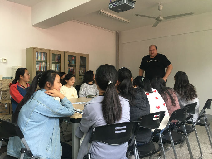 Matt老师是德国人,身材比较高大,刚到活动教室就引起了一番骚动,同学们对于这个初次见面的外教都感到陌生又好奇。