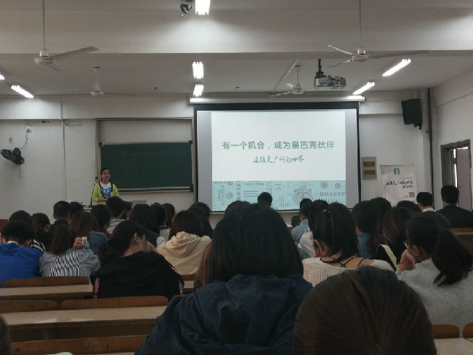 第二位是星巴克咖啡公司的负责人。星巴克在全国拥有3200家门店,并致力于在2021年达到5000家。负责人介绍到,星巴克的发展空间很大,只要员工认真努力,最快可以在两年内达到门店经理的职位。负责人还向我们详细介绍了星巴克的优厚福利,住房津贴、父母关爱计划等,相信一定有不少同学为此心动了吧。