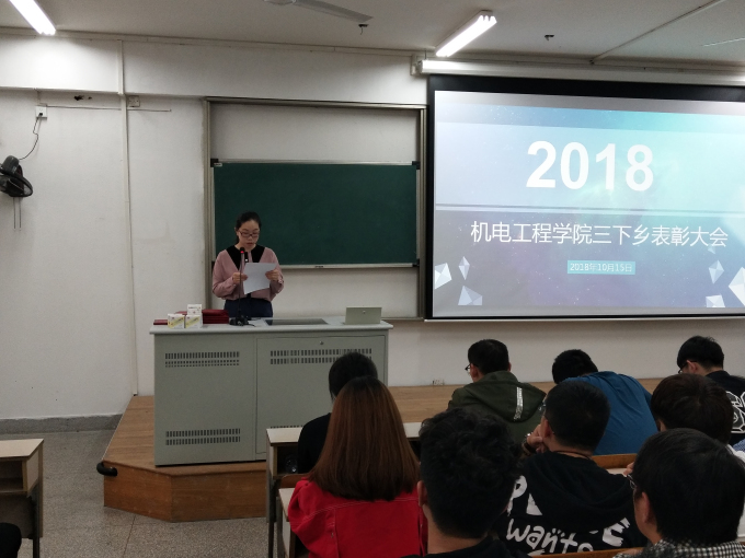 为总结2018暑期“三下乡”社会实践活动的开展情况,表彰优秀队伍及先进个人,10月15日下午,机电工程学院2018暑期“三下乡”社会实践活动表彰大会在7号楼320教室举行。党总支副书记杨学圣、分团委书记许心怡、辅导员王明鑫及受表彰学生、全体2018级学生参加了此次大会。