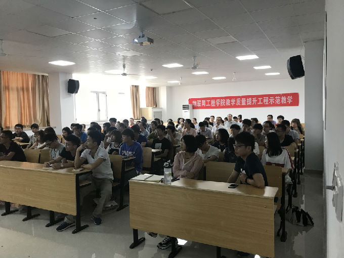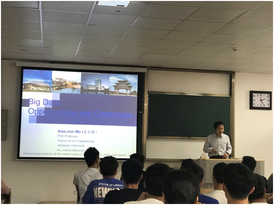 6月7日下午,江南大学科研院院长,二级教授博导,江苏省模式识别与计算智能工程试验室主任吴小俊博士来物联网工程学院作《大数据:机会与挑战》的专题讲座。这是我院开展双语示范性教学示范课的重要活动。院长惠晶,副院长方宁生、李莎等领导以及物联网工程学院师生参加了讲座。