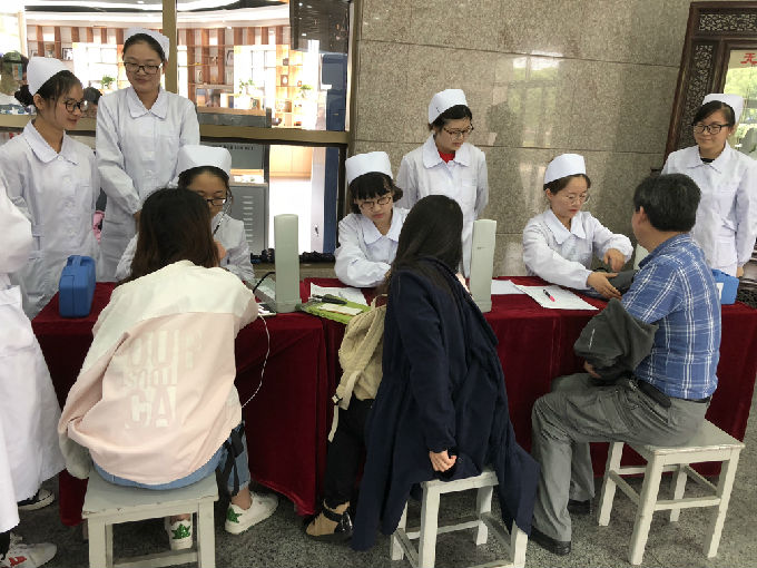 活动时间为上午9点到下午3点30,本次活动共持续两天。护理学院大一学生在学姐的带领下,认真地为往来的老师和同学们测量血压,还细心地为每一位做了相关数据记录。