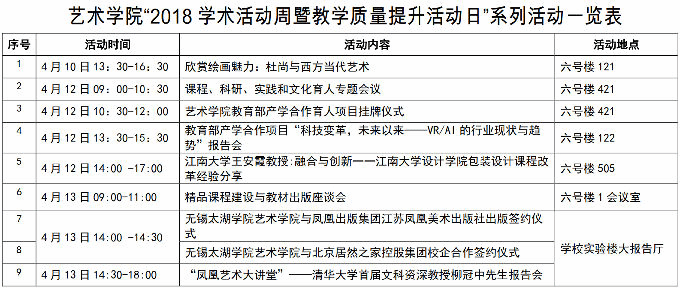 两场座谈会,“课程、科研、实践和文化育人主题工作会议”、“精品课程建设与教材出版座谈会”。“课程、科研、实践和文化育人主题工作会议”就我院的课程、科研、实践和文化育人工作展开。本次会议是学校“课程、科研、实践和文化育人主题工作会议”巡讲的第一站,王心如副校长率科技处副处长张乐、督导办主任薛瑜容出席会议,王校长巡讲首站选择了我院,是对我院工作的一种关怀和肯定。会议对于我院课程建设和学科发展做出了整体的规划,为我院后期工作的开展指明了方向。“精品课程建设与教材出版座谈会”。本次座谈会为艺术学院的课程建设送来了一场及时雨,可谓意义重大。通过座谈的形式,出版社和教材编著者相互沟通,有助于把握后续教材主题的准确定位和内容的撰写方向。在未来的合作中,学院、出版社将共同发力,物化学术成果。江苏凤凰美术出版社将全力为我院教师在精品课程建设和教材出版方面提供更好的平台。