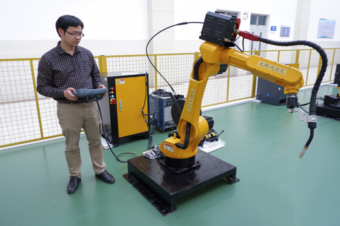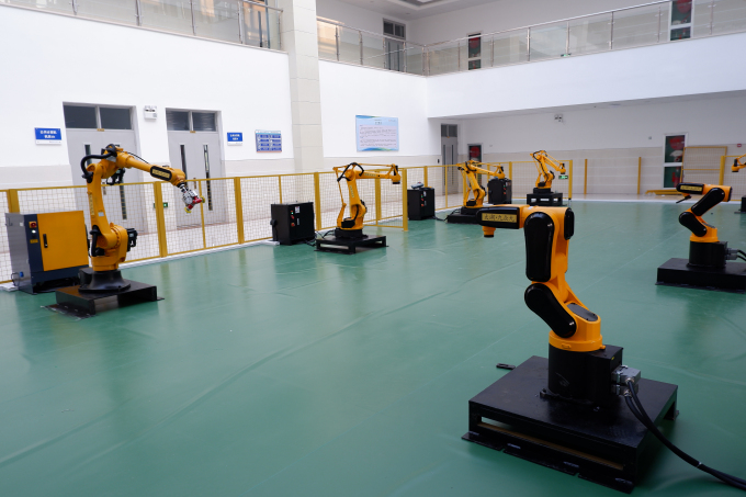 当日上午,姜斯平教授、机电系陈炎冬、实验室匡程和蒋胤冰等全程参与筹备安置工作,争分夺秒地落实人员和设备,同企业技术员一起协调和施工,从无到有,按工业化要求设计了“20米x9米”的场地,完成地面铺设、护栏的铺设和电气的施工等先期工作,同时,安装不同品种共9台工业机器人(2台焊接机器人、4台码垛机器人、2台多关节6自由度机器人、1台打磨抛光机器人)。最终,经过现场的反复调试,所有设备均达到实训操作要求。此实训中心的建设和投入使用,也将进一步带动我院实践能力的提升。
