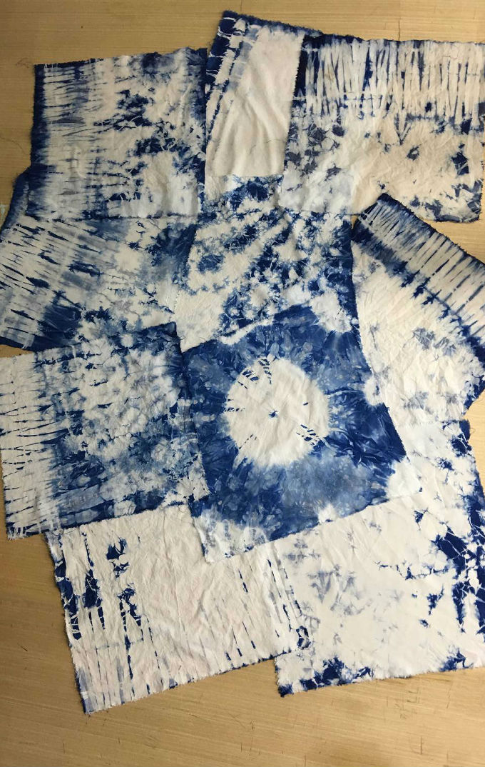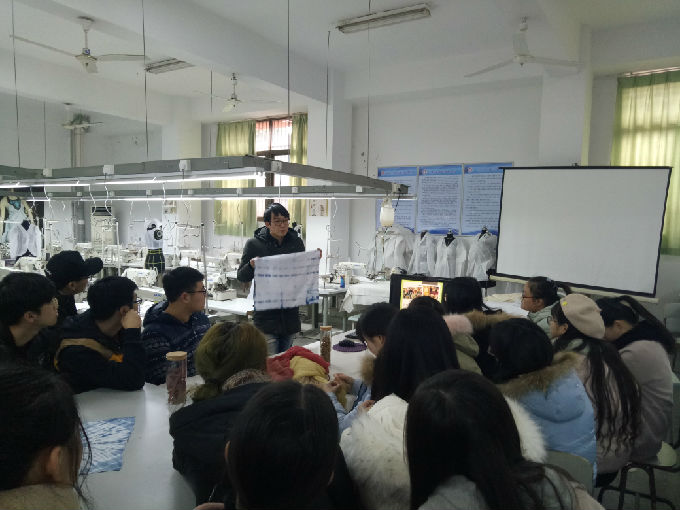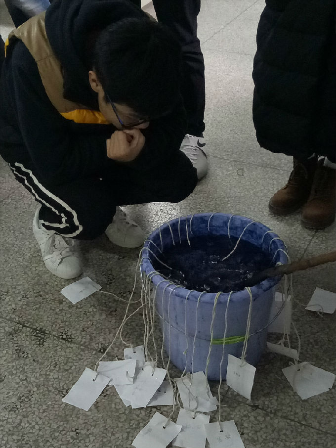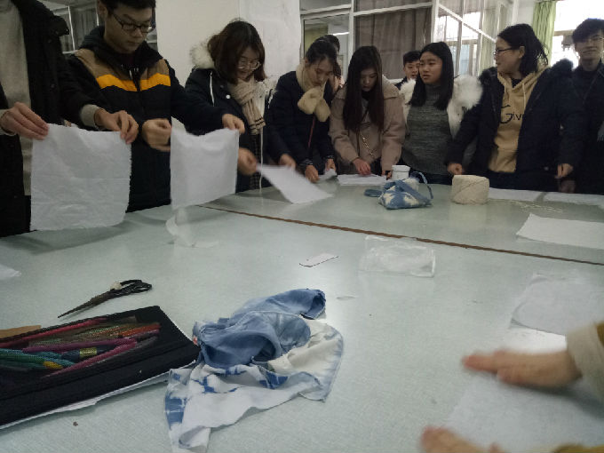 2018年1月,在朱宁老师的带领下,由学院扎染工作室的学长首先为组员们介绍了这项工艺,扎染的历史、分类、染料及一些简单的扎法在他的讲述下逐渐立体起来。扎染的染料分类亦很繁多,板蓝根、姜黄、红木……并分常温和高温两种染料染时温度,植物染料比现在的化学染料要好,有些更有利于人体健康,而且还十分契合当下的环保理念。