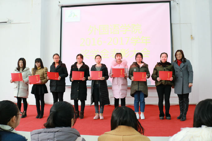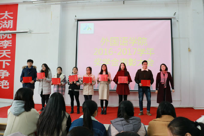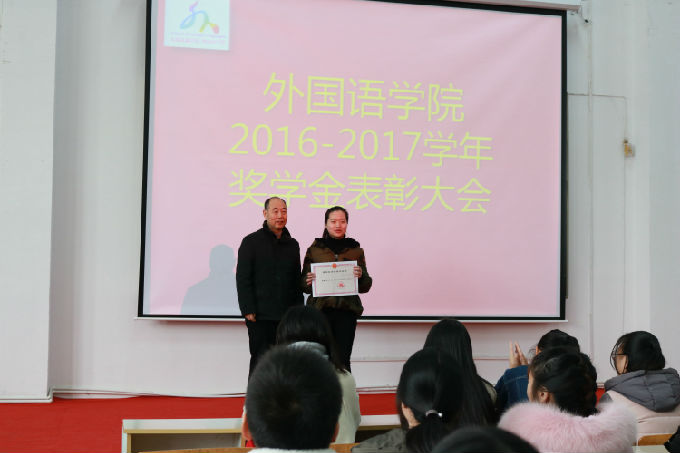2017年12月27日下午,外国语学院2016-2017学年奖学金表彰大会在7号教学楼102教室隆重举行。出席本次表彰大会的嘉宾有外国语学院院长包通法、外国语学院副院长刘荔、副院长吴旻昊和外国语学院党总支副书记郁群英,大会由学院学工秘书俞昊波老师主持。同时,我院三百余名奖学金获得者和大一的新生也参加本次表彰大会。